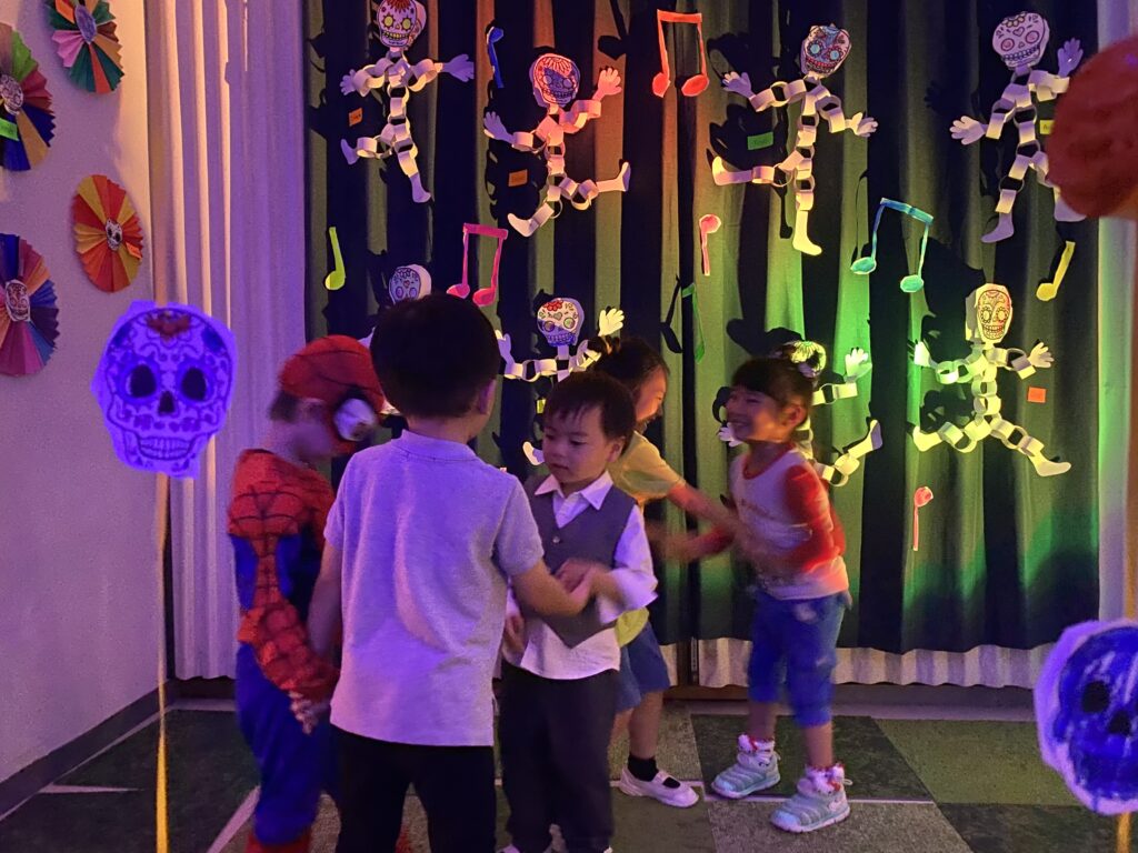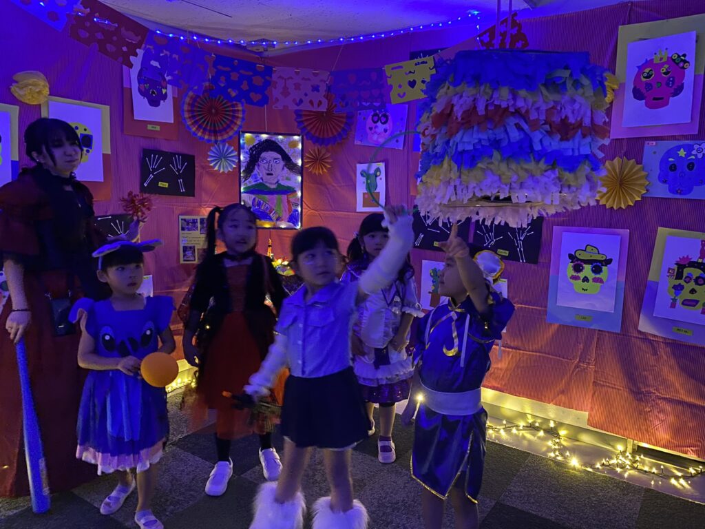 輪投げをしたり、スケルトンと一緒にダンスしたり、ピニャータを叩いたりと、大盛り上がり!