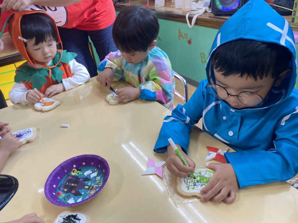 ハロウィンの絵本を読んだり、歌を歌ったり、工作でスクールを飾りつけたりしながら、みんなでパーティーを楽しみに準備してきました。