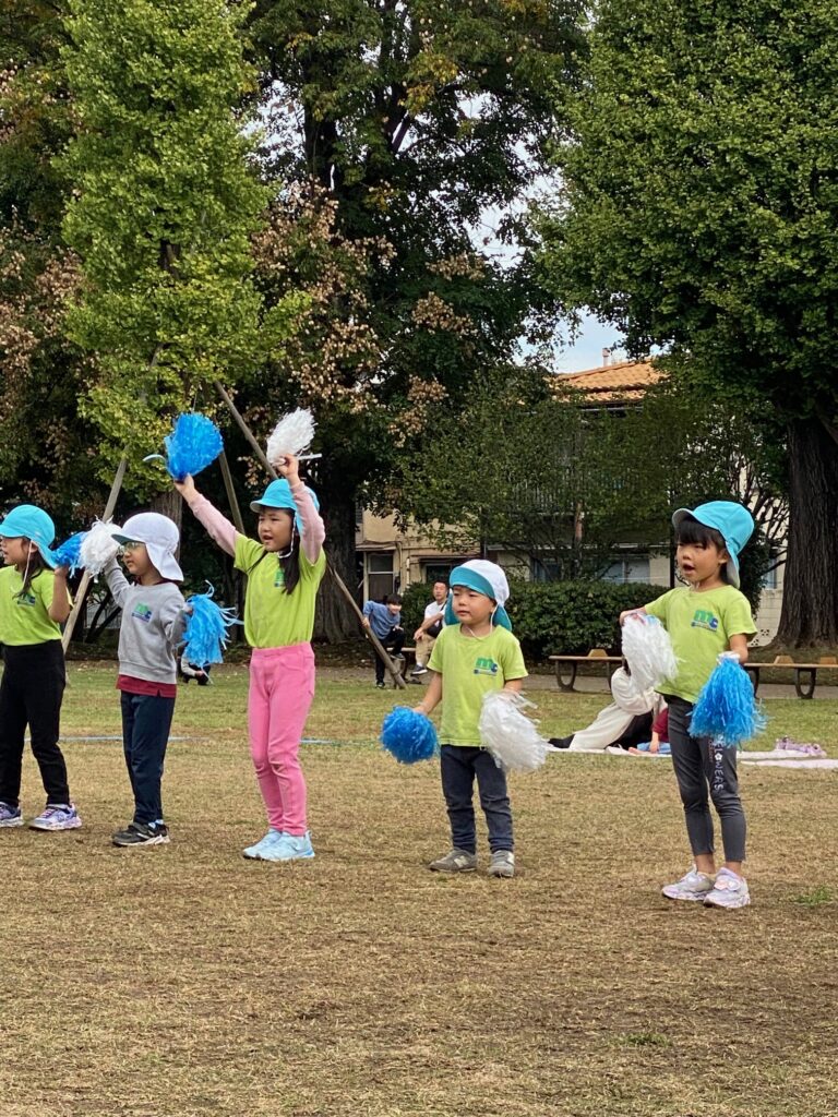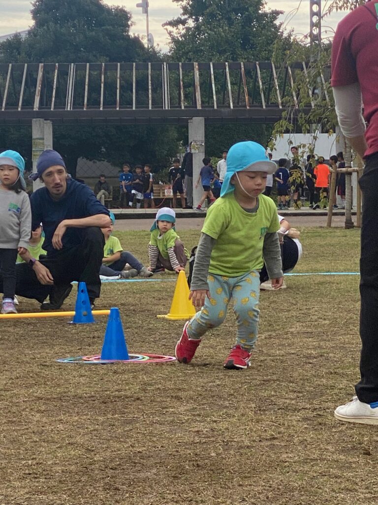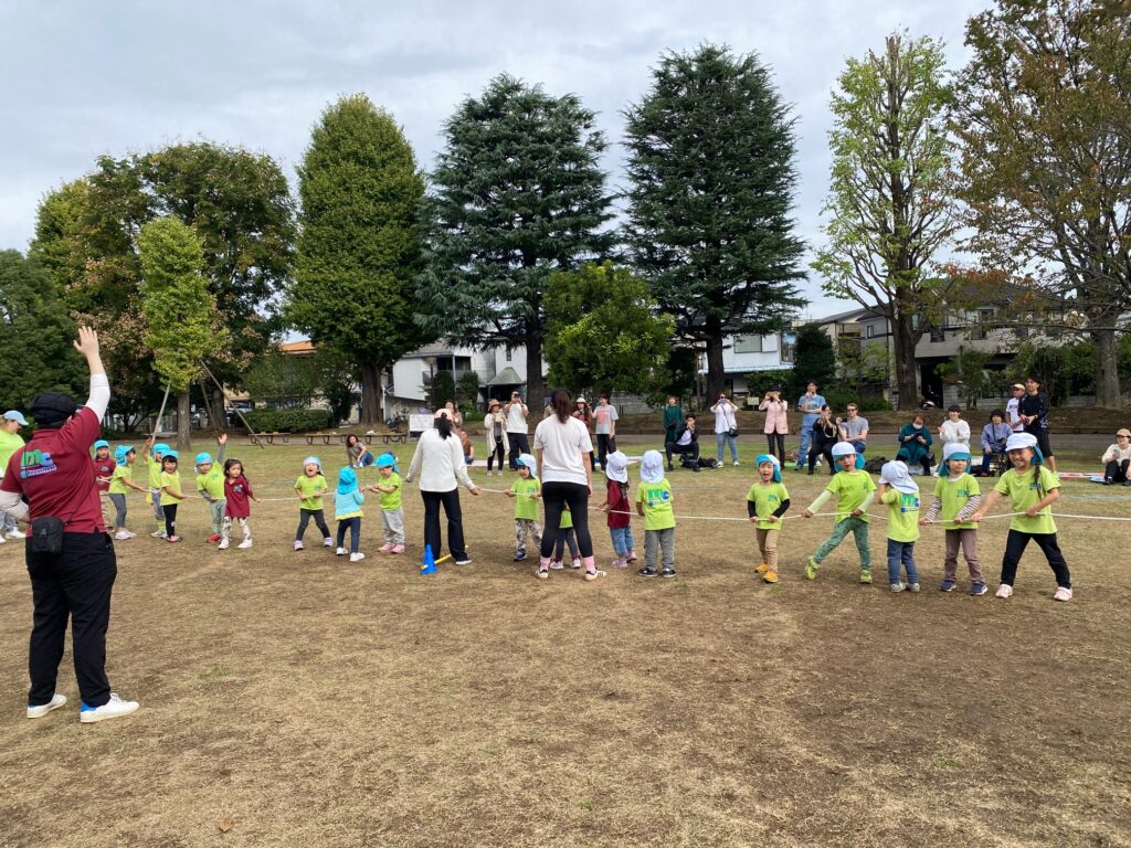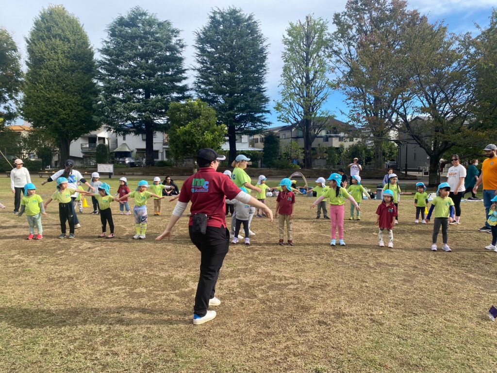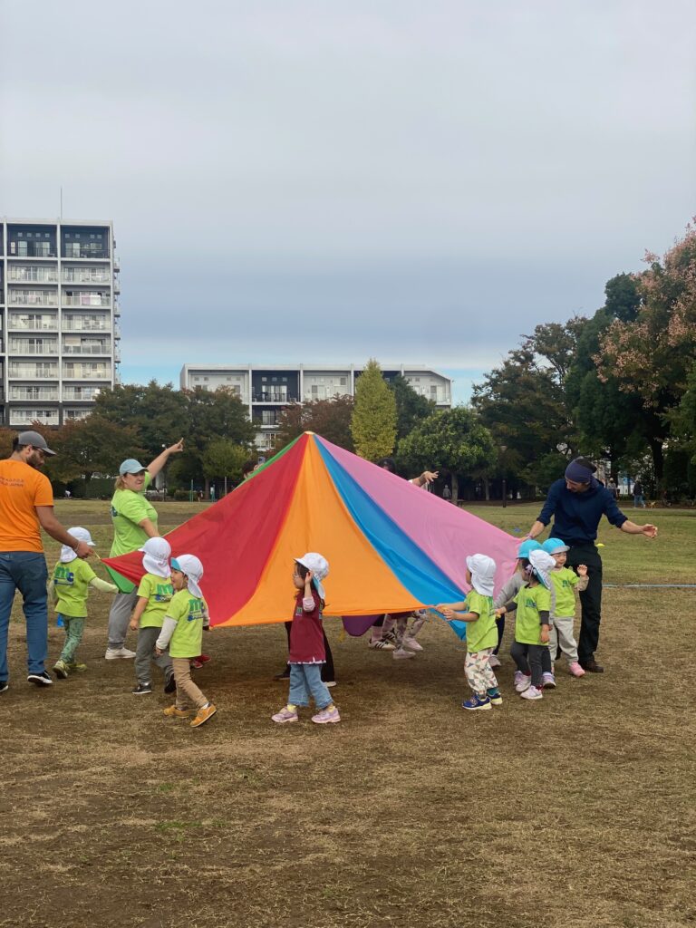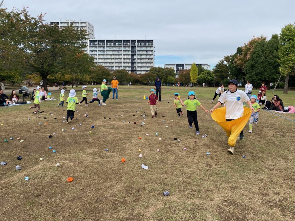 広い芝生の上で、わくわくしている子もいれば、保護者の方から離れるのが寂しい子もいましたが、それぞれの姿で競技を楽しんでいました。2歳児・3歳児クラスはパラバルーンを行い、親子競技では、みんなで色を塗った車を使って Car Wash Race などを楽しみました。